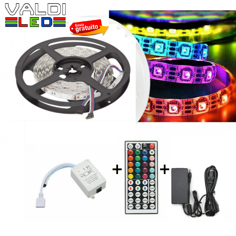 Tira de 300 LEDs 72W SMD5050 12VDC IP33 Multicolor RGB Transformador/Controlador x5M y Envío Gratis.