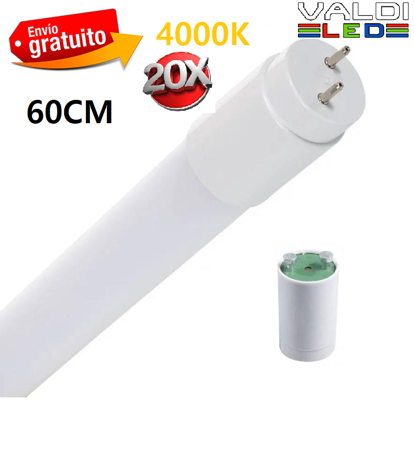 Pack de 20 Tubos Led T8 60cm 9W de Cristal 4000k Neutro con Conexión un Lateral y Envío Gratis.